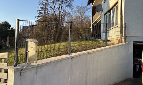 Doppelstabmatten schwer feuerverzinkt und anthrazit beschichtet mit Pfosten 60 x 40 mit Abdeckleisten einbetoniert |