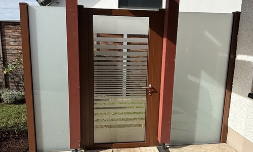 Glas Sichtschutz mit vierkant Aluminium-Nutpfosten einbetoniert |
