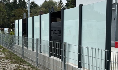 Glas Sichtschutz mit vierkant Aluminium-Nutpfosten mit Fussplatte |